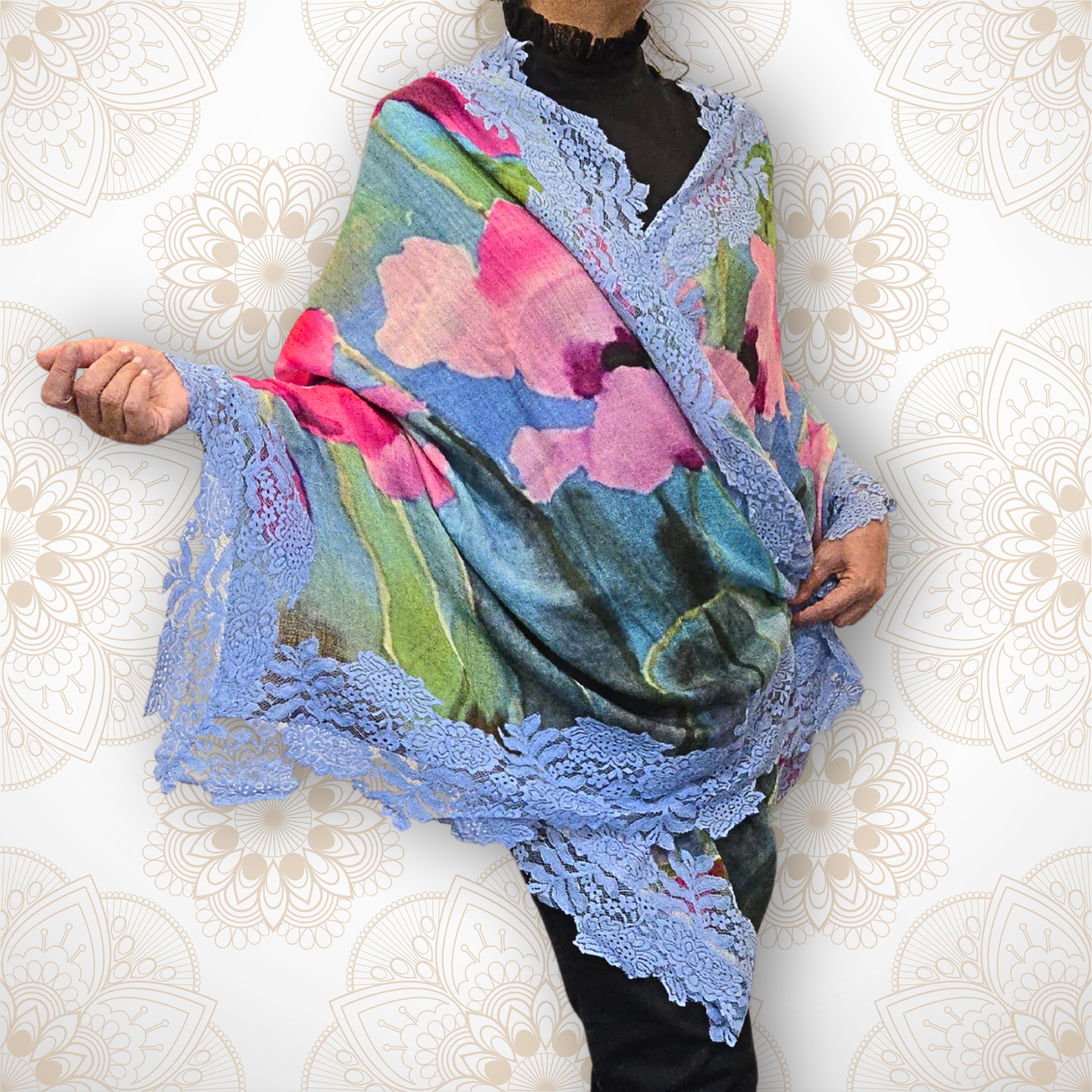 Shop HereInject a splash of color into the changing weather of the season with our stunning Monet-inspired printed Pashmina blend shawls adorned with delicate lace trim.