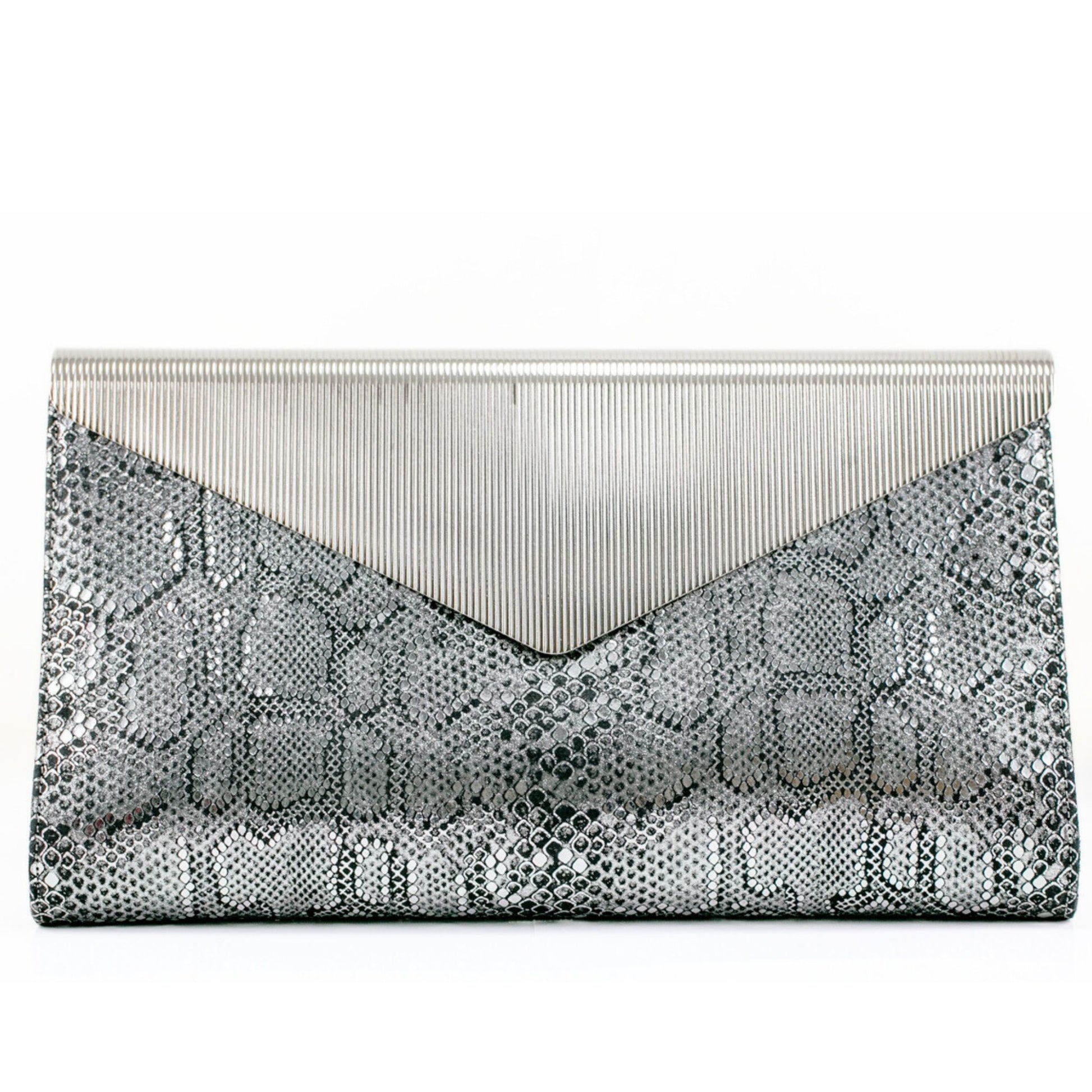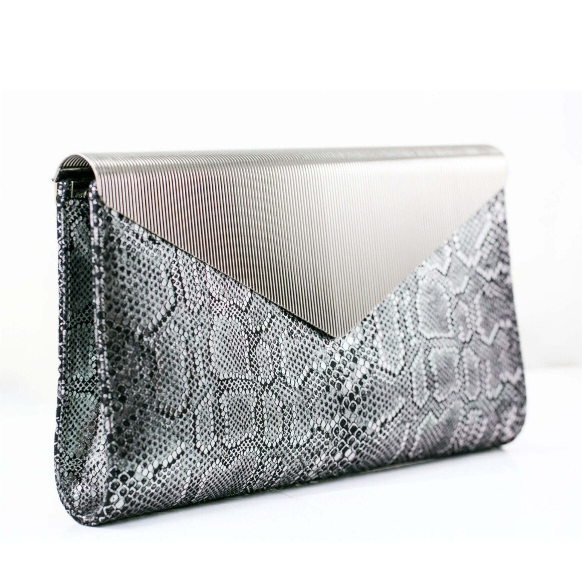 Snake embossed leather purse with metallic flap featuring a vertical textured pattern. Interior lined with soft grosgrain, with detachable snake chain strap. Comes beautifully boxed with a keepsake bag.