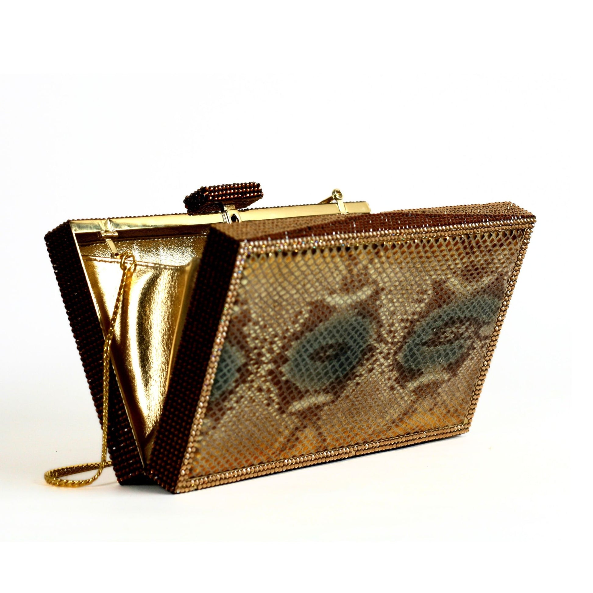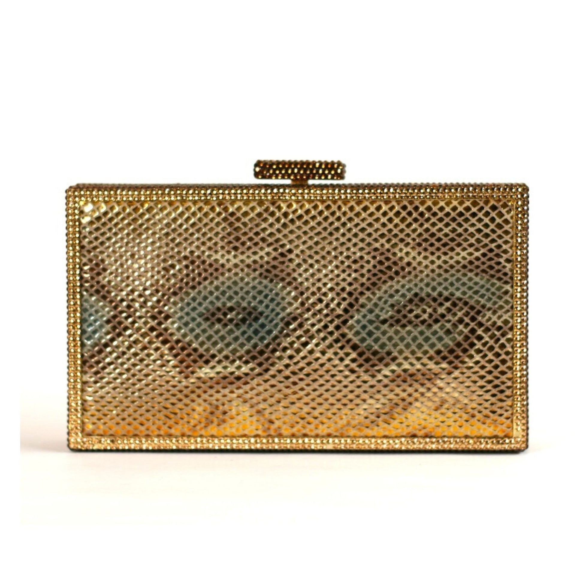 Hard case covered in Italian leather with snake print and framed with Swarovski crystals in matching gold and bronze hues. Push lock clasp. Comes with removable snake chain, and beautifully boxed with a keepsake bag. Generous size, perfectly fitting your smartphone and essentials.