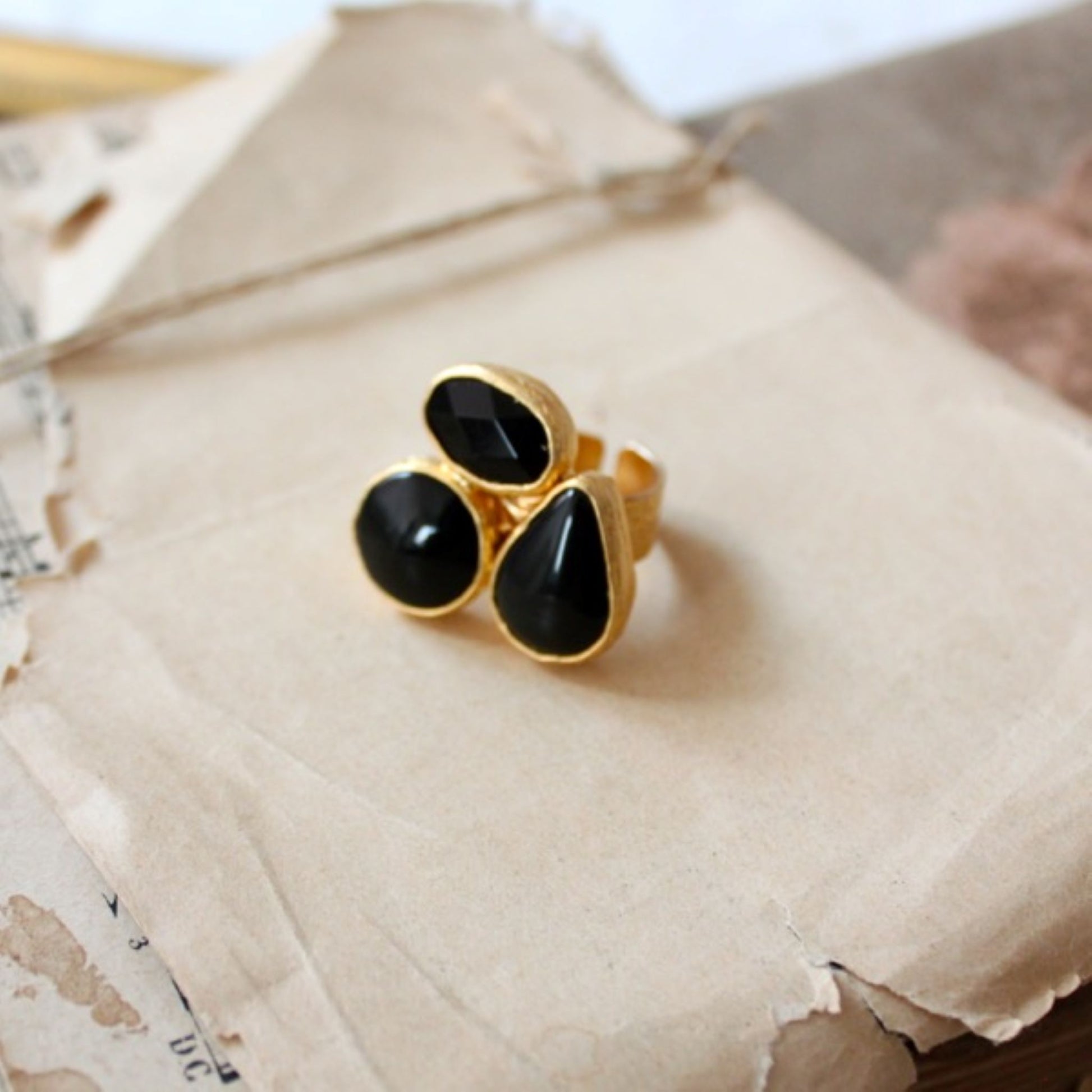 Bold cocktail ring on an adjustable ring band featuring a trio of natural onyx stones wrapped in hammered gold. As all rings are individually handcrafted and made with natural onyx, there may be slight variations in each piece.