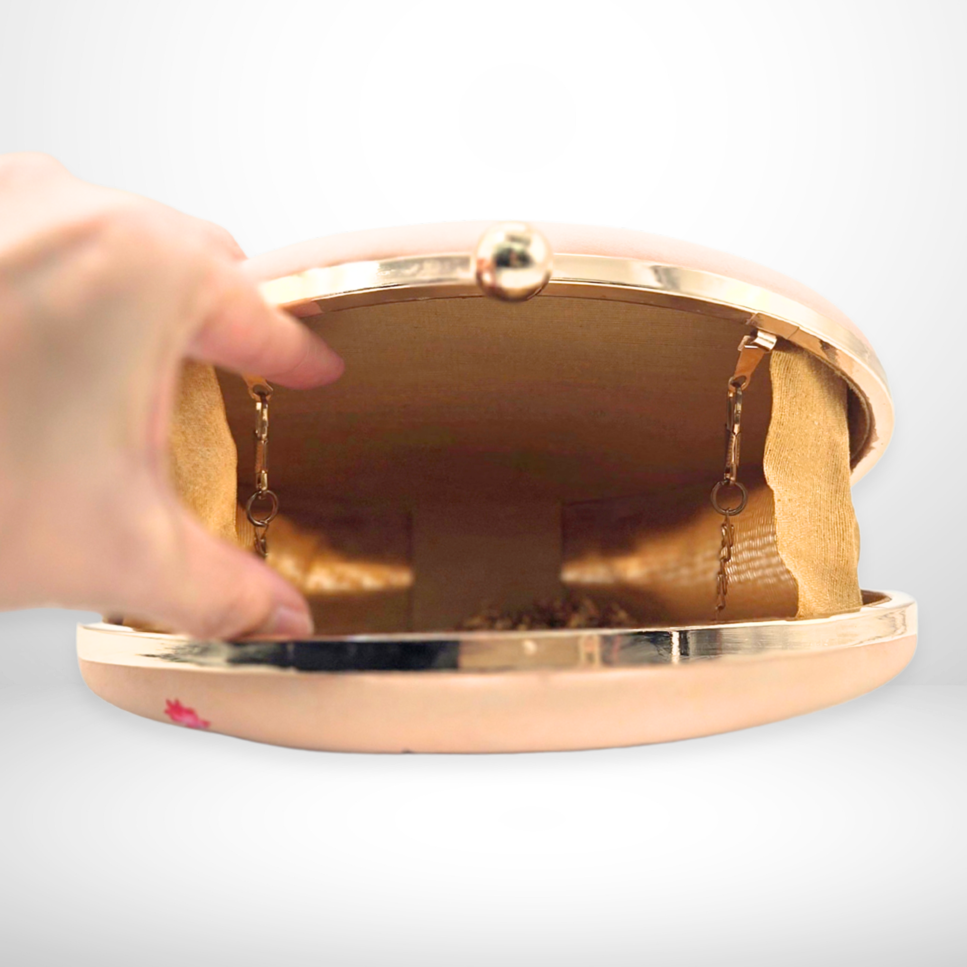 Chic beige oval box clutch featuring a vibrant Indian elephant design, gold hardware, and premium fabric finish—perfect for weddings, parties & cultural events. The roomy interior accommodates a smartphone, keys, and other essentials, and a detachable gold chain strap for versatile carrying options. The button push-back clasp closure ensures secure closure.