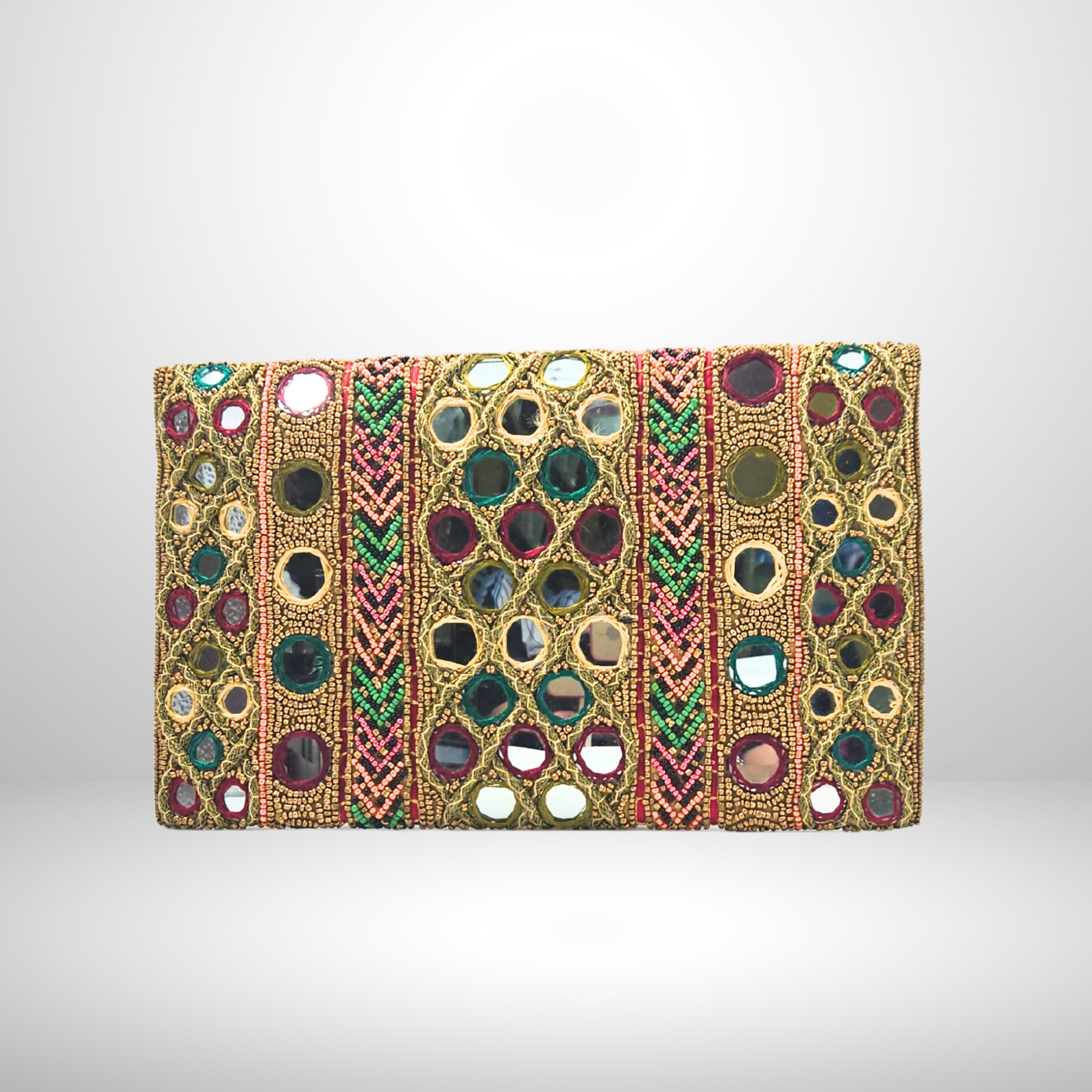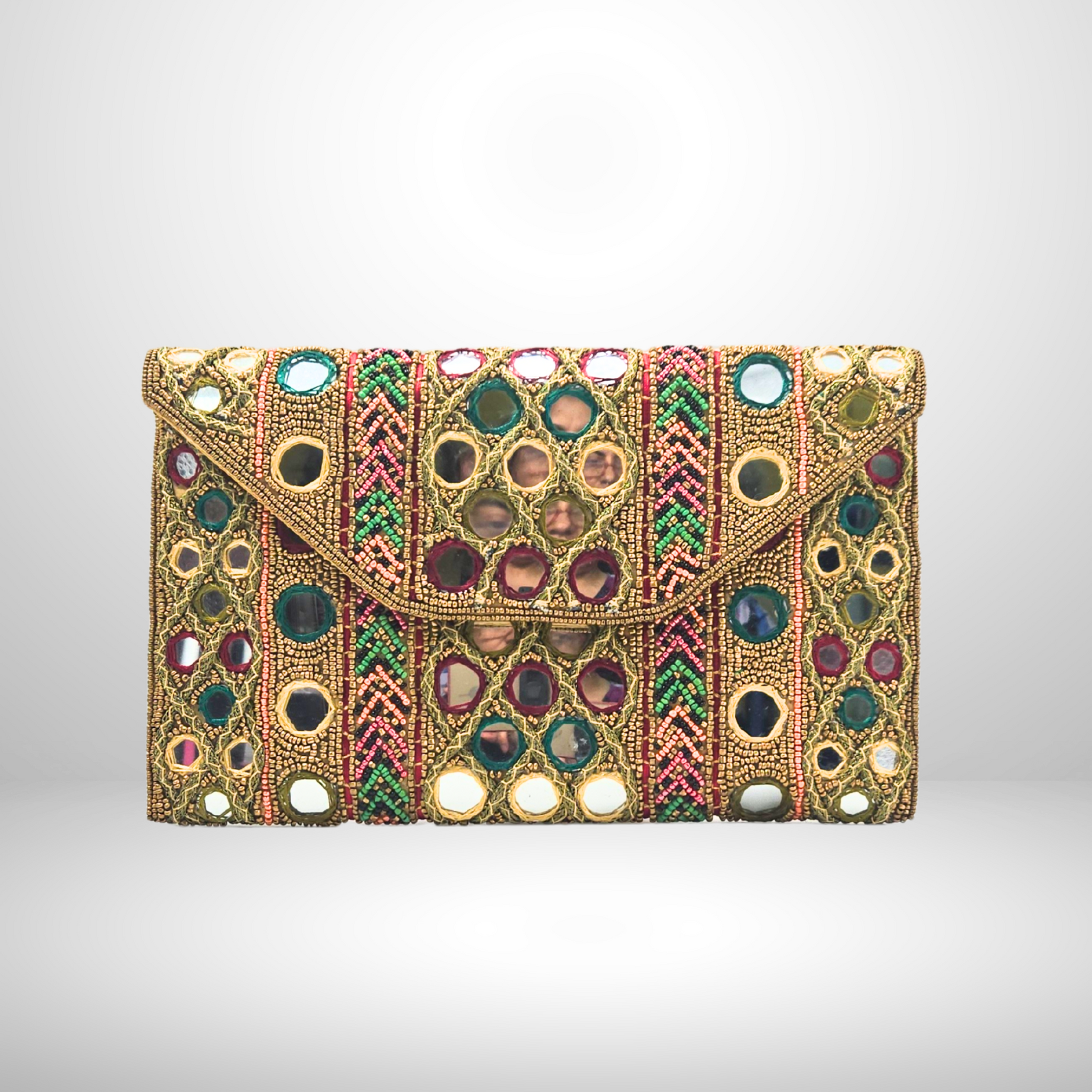Handcrafted with vibrant textiles and intricate embroidery, this "mirror-work" envelope bag is a perfect blend of tradition and style. A unique work of art, this stunning clutch comes with an additional long chain strap, and will add a pop of colour and boho charm to any outfit.