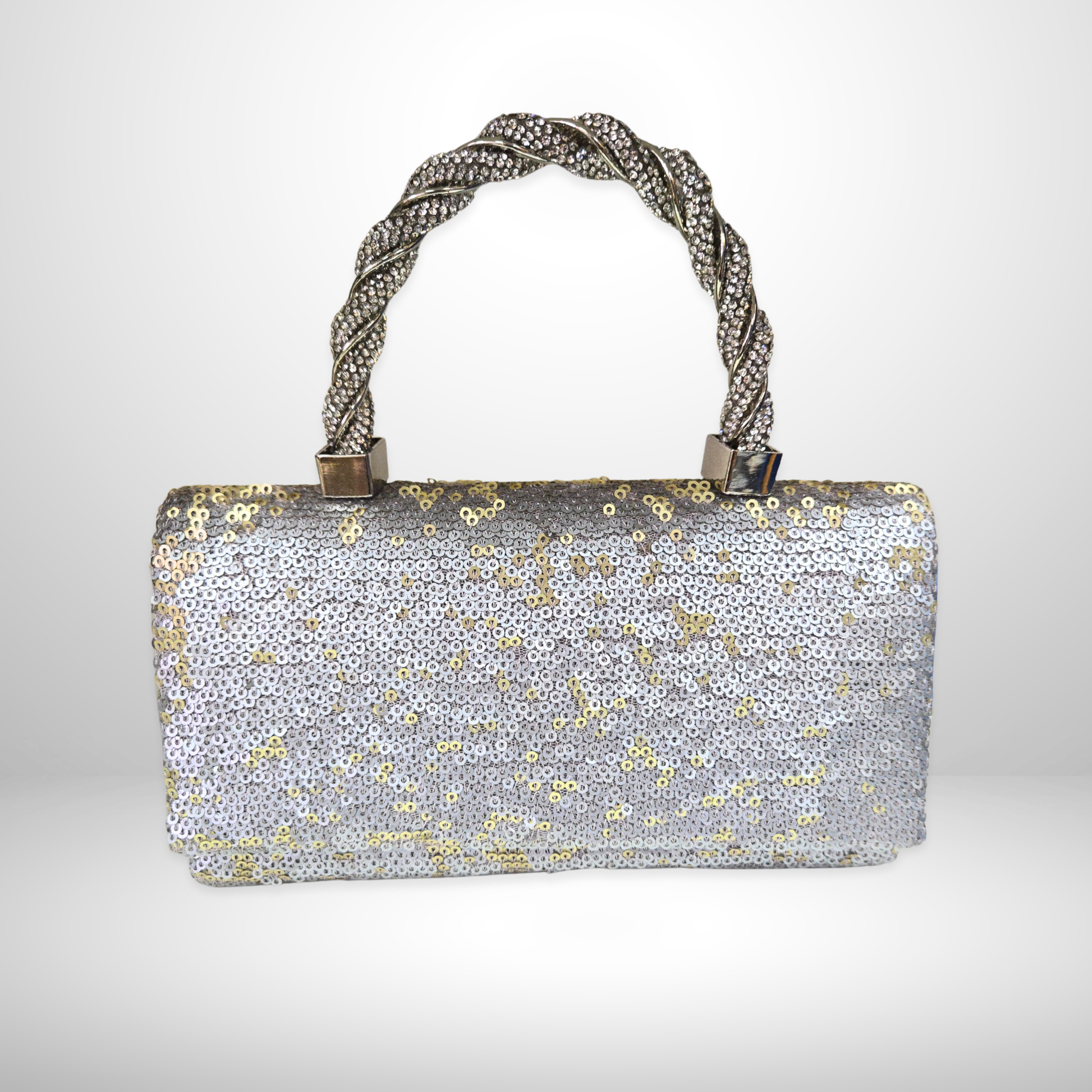 Charming party purse featuring dual-tone sequins and an elegant diamante handle, offered in silver or gold. Includes a detachable long strap for versatile carrying. Perfectly sized to hold your mobile phone.