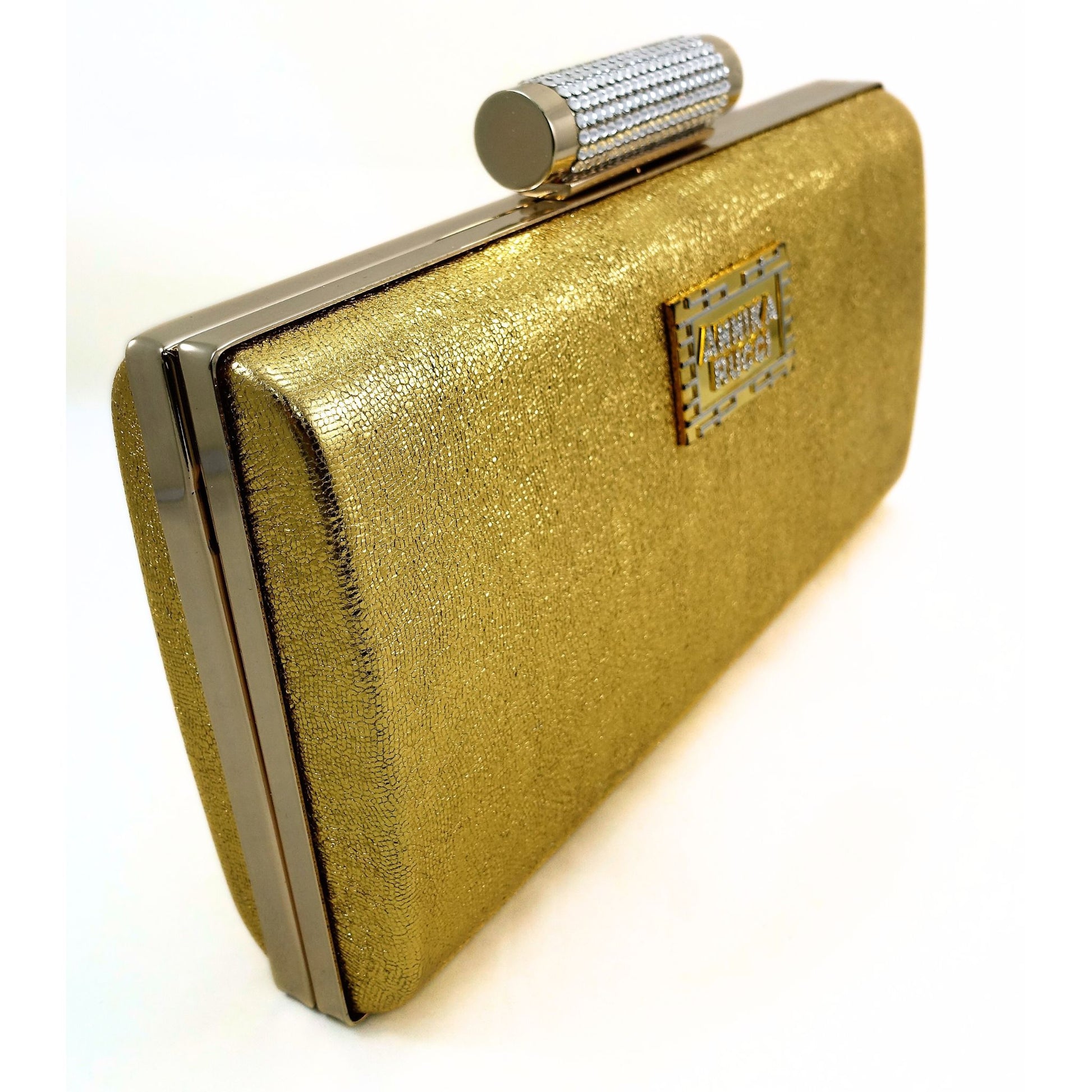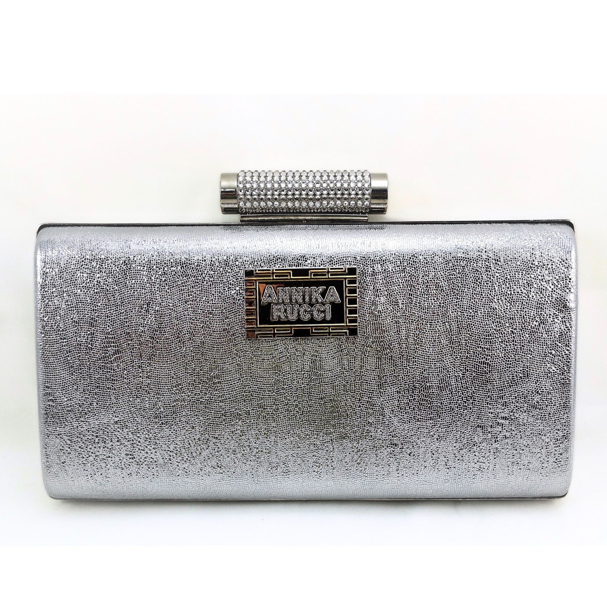 Glitter textured Italian leather bound hard clutch featuring a push back crystal encrusted clasp, and a crystallised “Annika Rucci” metal logo on the body. Interior in striking Annika Rucci fuschia pink satin. Comes with detachable snake chain, and beautifully boxed with a keepsake bag. Slim yet large enough to accommodate your smartphone and other essentials.