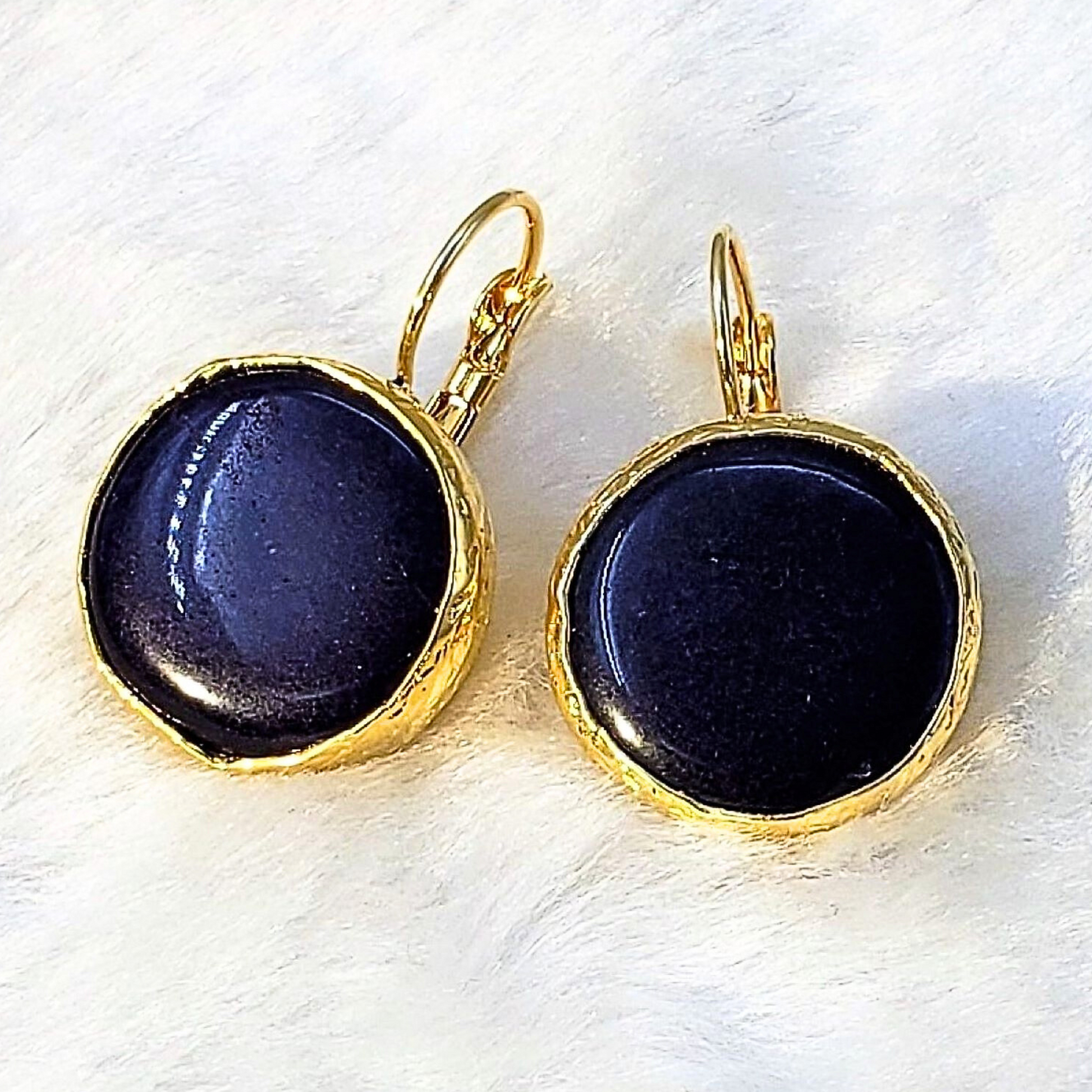 圓形寶石耳環由半寶石和 24K 鍍金純銀製成。由於每對耳環均單獨手工製作並使用天然寶石,因此可能會有輕微差異。大尺寸的寶石直徑為 0.75 英吋。
